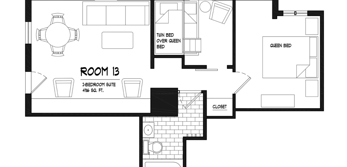 Our largest accommodation, the two bedroom-one bathroom suite, sleeps up to five guests. Bedroom 1 sleeps two people in one queen bed. Bedroom 2 sleeps 3 people in one queen bed and one lofted twin bed. The living room features a sectional couch, a round dining table and a long counter/desk. This room features a bath tub/shower combo, VT bath and body products, flat screen TVs and a mini refrigerator with freezer. Located on the second floor with stair access only. Rollaway beds are subject to availability and a fee.