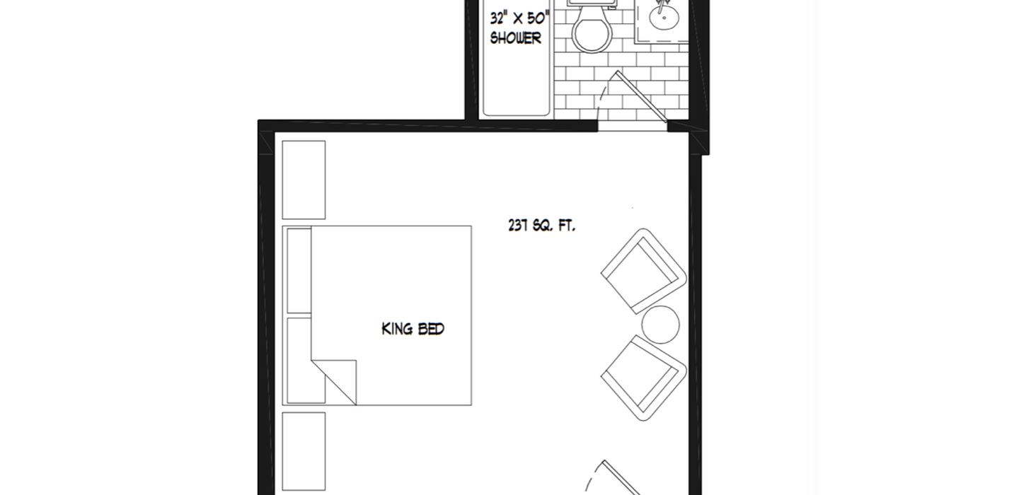 Our king rooms sleep two people in one king bed and feature a walk-in shower, VT bath and body products, flat screen TVs and a mini refrigerator with freezer. Each king room has a unique layout and all are located on the second level with stair access only. Rollaway beds are subject to availability and a fee.